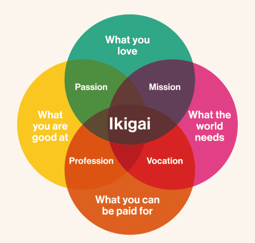 Although I’m no Shakespeare, the fact that you’re sitting reading my waffle means you mustn’t think I’m that appalling either. (Please just lie to yourself if you do, for my sake, emotions are fragile flower petals after all). I’m not much of a singer, or actor, or……there are too many vocations to list to be honest. But then again, that’s fine because as great as these careers are, I’m not intrinsically drawn to pursue them. There’s a fantastic Japanese concept called ‘ikigai‘ (ee-key-guy). ‘iki’ = life, ‘gai’ = worth. And the concept refers to something which gives a person a sense of purpose. Please see the figure below: